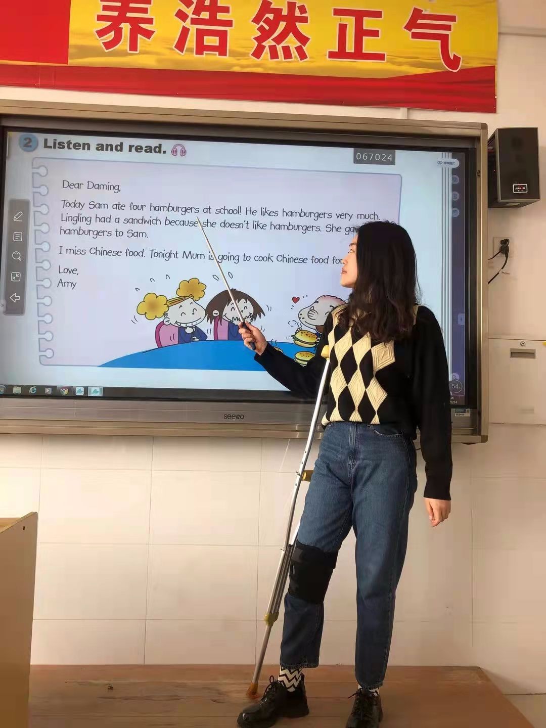 她的腿部依然肿胀,走路仍旧非常困难,但为了保证线上教学质量,郭琦老师坚持选择带伤上阵,拄着拐杖在教室的屏幕前为学生上好每一节课,只为学生有更好的学习效果。