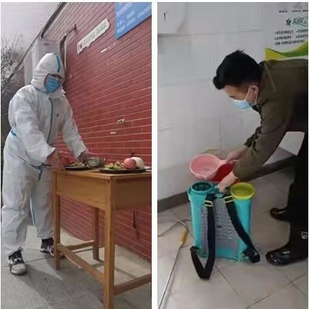 两位留在学校守护家园的青年党员教师,担负起了整个校园卫生清扫和消杀工作。每天按时清扫每一条走廊、教室,按时通风、消毒,连学校的植物都精心呵护着,校园的每一个角落都有他们悉心照料的身影,而“守护家园,我来”便是这两位年轻党员对信仰的生动实践。