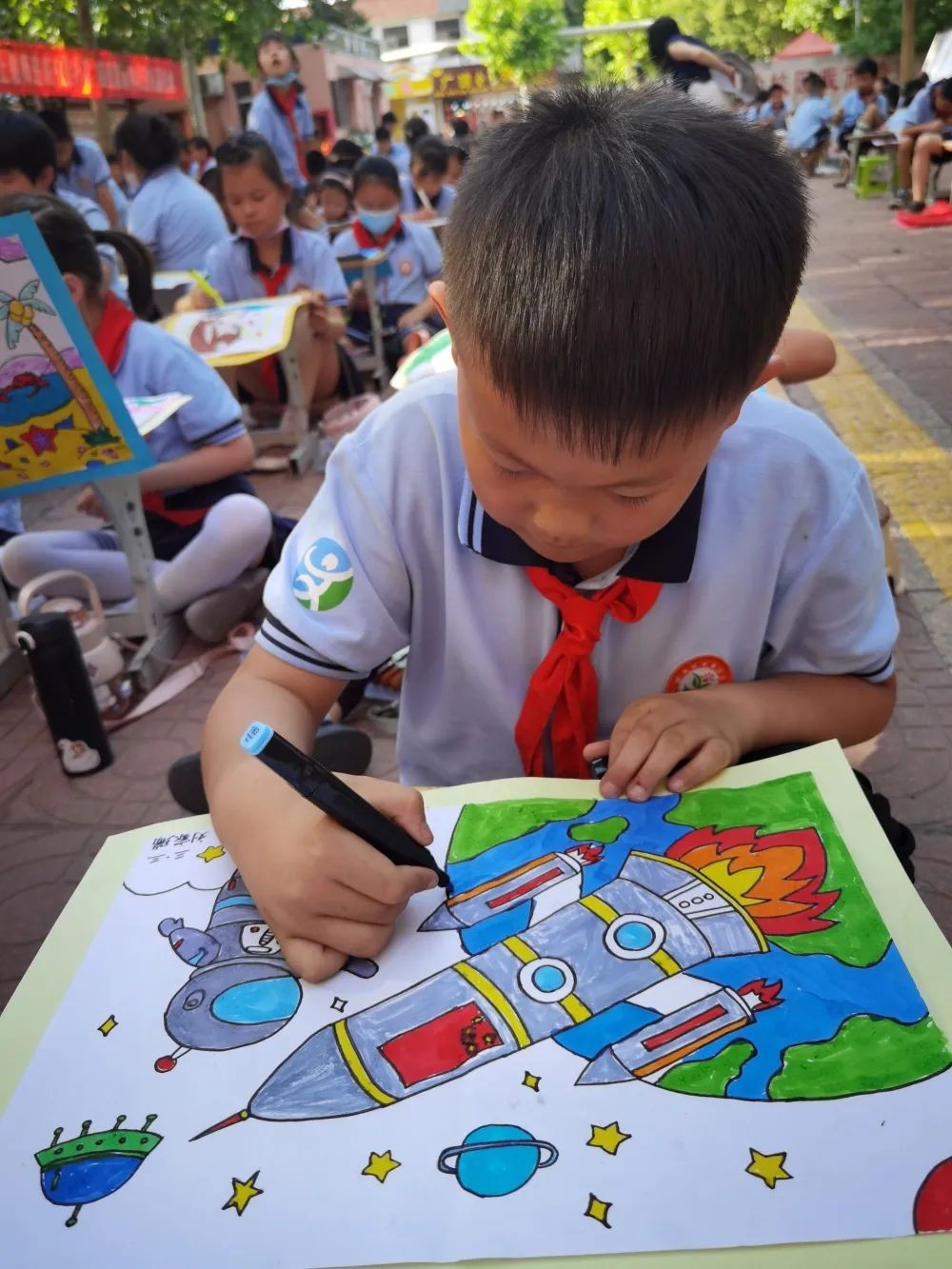 瞧!孩子有的趴在白色长卷上、有的坐在地上、有的坐在马扎上,以画为笔,以爱为笺,用稚嫩的小手在画卷上、在纸张上自由发挥,细心涂抹,描绘他们眼中的最美祖国,描绘心中美好的梦想。