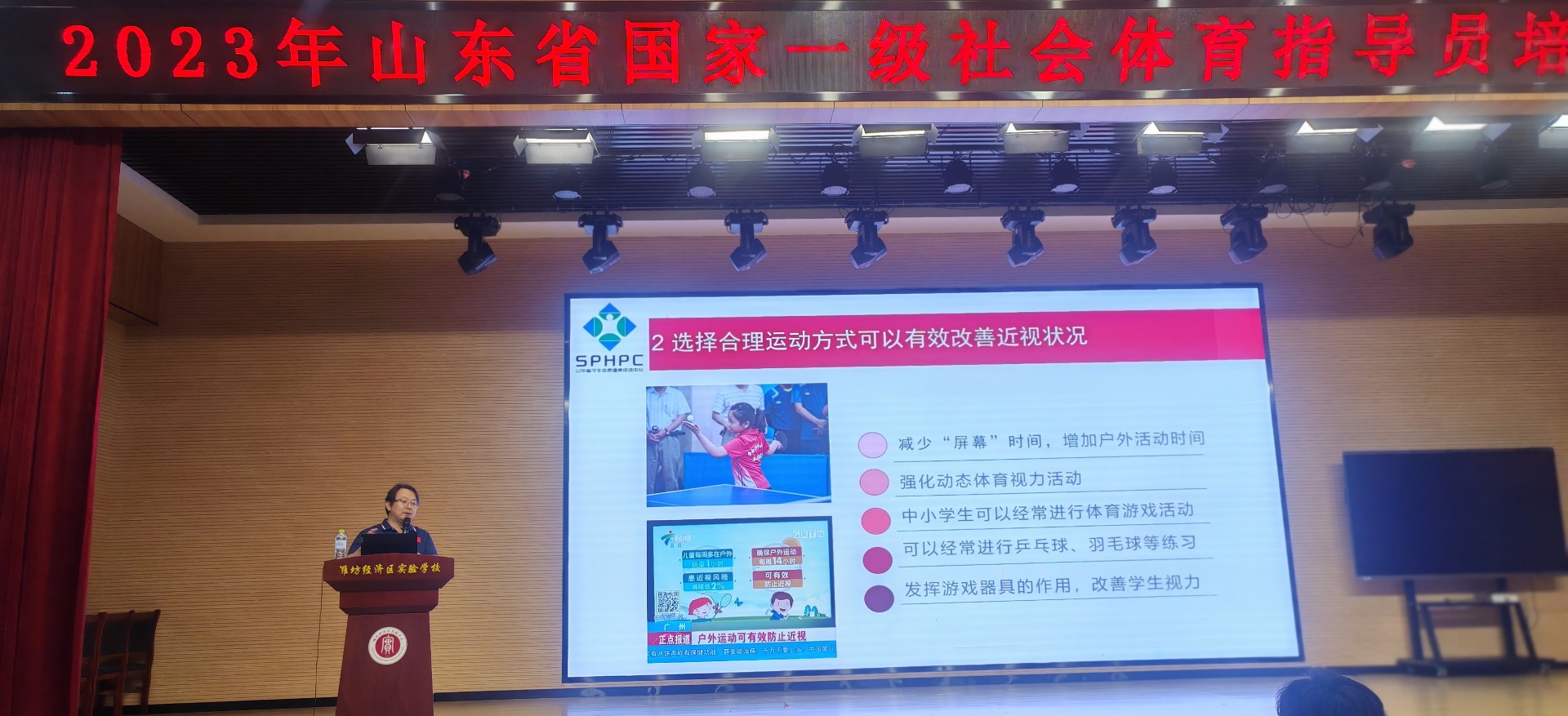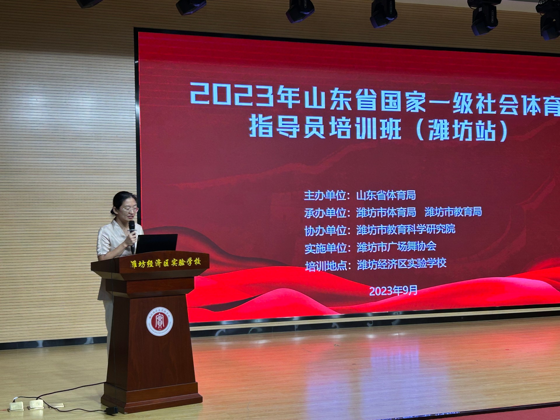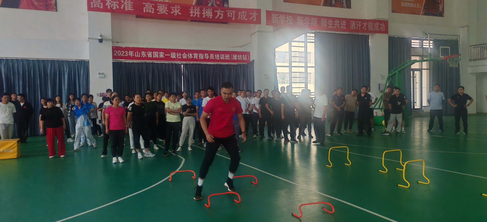 9月22日,2023年山东省国家一级社会体育指导员培训班(潍坊站)在潍坊经济区实验学校圆满完成,来自潍坊市各县市区符合条件的社会体育指导员骨干,以及积极参加群众健身服务的学校教师,共150余名一线社会体育志愿服务骨干集中参加培训。