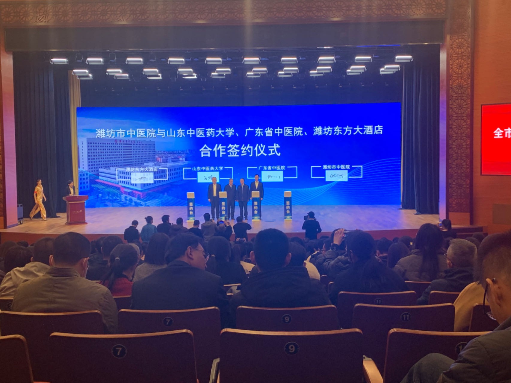 会上,潍坊市中医院与山东中医药大学、广东省中医院、潍坊东方大酒店签署全方位合作发展协议。