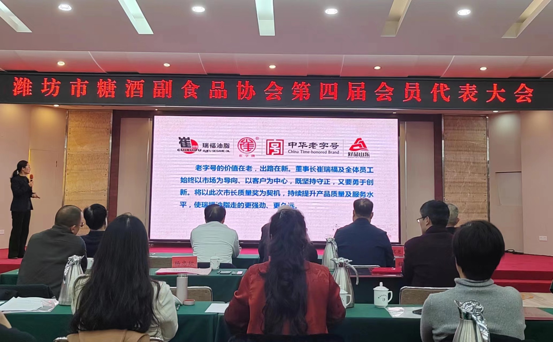 会上,被潍坊市政府授予“第十届潍坊市市长质量奖”的副会长单位——瑞福油脂股份有限公司,介绍了崔字牌小磨香油“以质量求生存、以质量谋发展”的经验和做法。