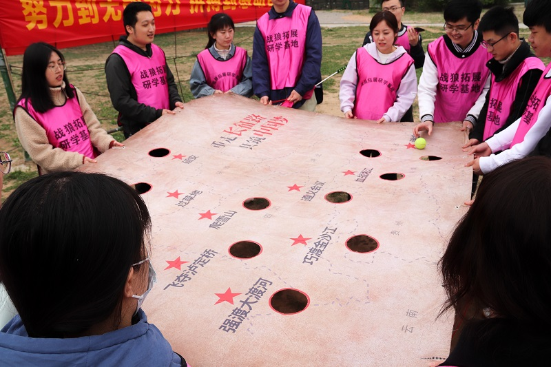 重走长征路要求青年员工们每人手拉着长征地图的边缘,团队协作、通力配合,让地图上的球沿着长征路线到达目的地,旨在通过追寻先烈的步伐,进一步坚定青年员工的理想信念;团队金字塔则更加考验青年员工的动手能力和协作能力,团队成员需根据模型图,将指定道具搭建起金字塔,再使用一根根连接在一起的线绳把网球放置到金字塔的顶端;而团队飞盘是一项融合了极限飞盘、团队建设特点的活动,要求队员们除了要有攻、防的技术外,也必须具备良好的团队精神、体能、速度、智能和意志力。