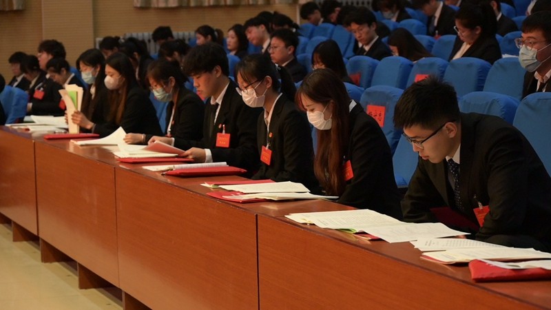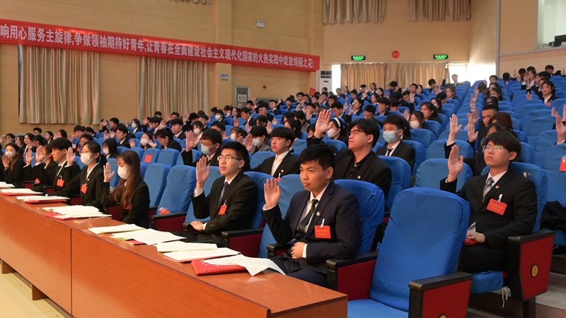 赵建辉代表兄弟高校团委致辞,工会主席孟祥亭代表学校群团组织致辞。徐加金代表共青团潍坊学院第三届委员会作题为《高举旗帜跟党走 勇毅前行谱新篇 为建设高水平应用型大学凝聚团结奋斗青春力量》的工作报告。周晓晗同学代表潍坊学院第21届学生会作题为《唱响用心服务主旋律 争做领袖期待好青年 让青春在新时代新征程的不懈奋斗中绽放绚丽之花》的工作报告。顾晓乐同学作第六次学生代表大会提案工作报告。