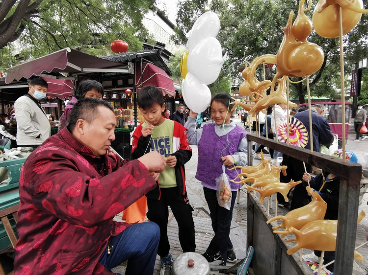 儿子是孩童,关注的主要是吃和玩。没吃过的都想品尝一下,那还了得,撑破肚皮也吃不尽,只好控制他品尝两三样特色小吃。玩的项目多的是,他喜欢射击、射箭、投壶、吹糖人,等等。因为大人心疼钱,让他每每意犹未尽,恋恋不舍,盼着下次再玩。