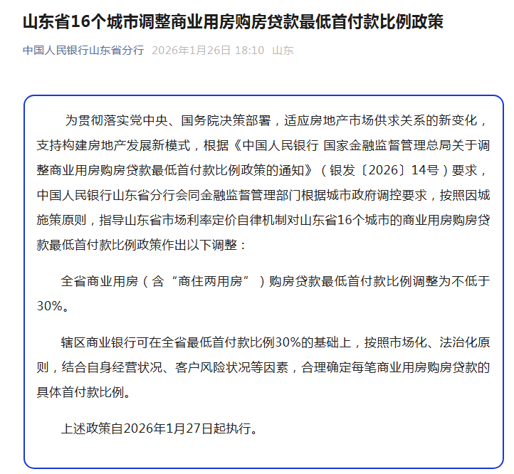 为贯彻落实党中央、国务院决策部署,适应房地产市场供求关系的新变化,支持构建房地产发展新模式,根据《中国人民银行 国家金融监督管理总局关于调整商业用房购房贷款最低首付款比例政策的通知》(银发〔2026〕14号)要求,中国人民银行山东省分行会同金融监督管理部门根据城市政府调控要求,按照因城施策原则,指导山东省市场利率定价自律机制对山东省16个城市的商业用房购房贷款最低首付款比例政策作出以下调整: