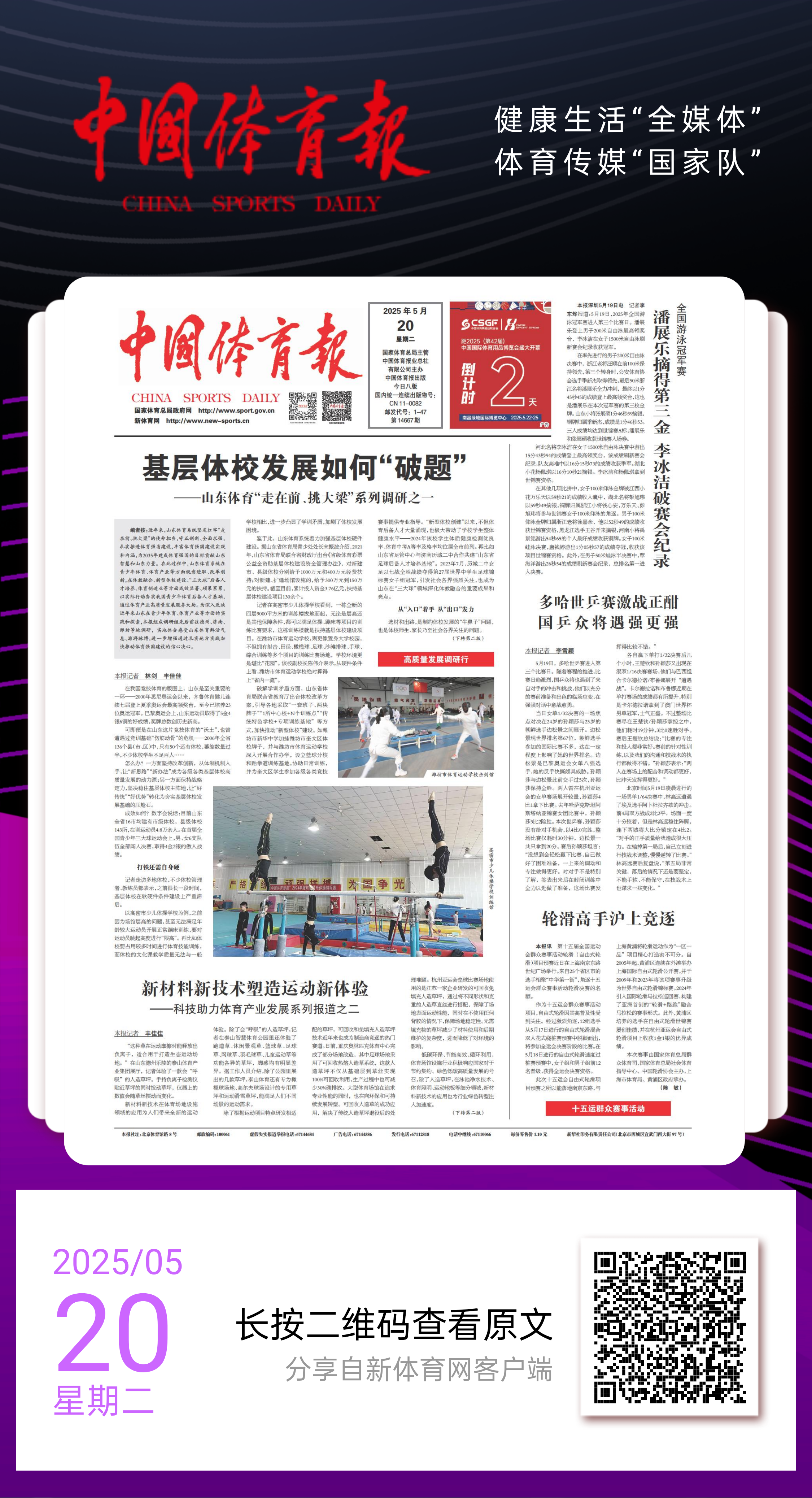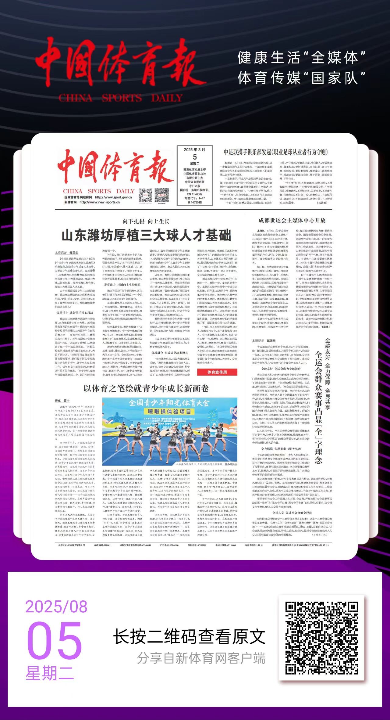 体教融合走深走实,《中国体育报》三次头版刊发潍坊做法。推广体教融合“奎文模式”,突出抓好体育特色学校建设。构建体校、体育协会、体育俱乐部、普通中小学“四方联动”机制,与23家中小学共建“足球特色校”,16所学校入选全国校园武术试点,21家青少年俱乐部获评星级俱乐部。开展“冠军进校园”志愿服务潍坊行活动。