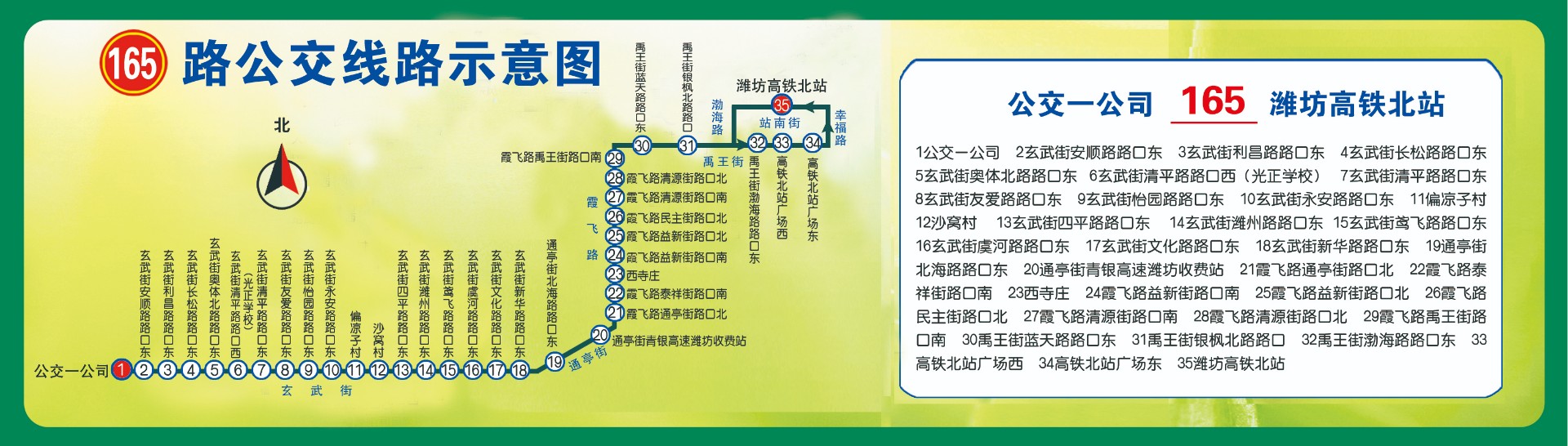 165路公交线从公交一公司发车,经玄武街-通亭街-霞飞路-禹王大街-幸福路-站南街至终点站潍坊高铁北站。上行线设置35处站点,下行线设置35处站点;公交一公司首班6:30,末班18:00;潍坊高铁北站首班7:30,末班19:00(首日第一班在线路开通仪式结束后发车)。该线路贯通玄武街东西,覆盖玄武街(月河路至怡园路)、霞飞路(益新街至禹王大街)等路段公交盲区,途经光正实验学校、智群学校、文昌中学等学校,同步串联偏凉子村、沙窝村、百汇大市场、北美枫情等地点,进一步推动潍坊市公交健康协调发展,增强了沿途群众出行的普惠感、幸福感。