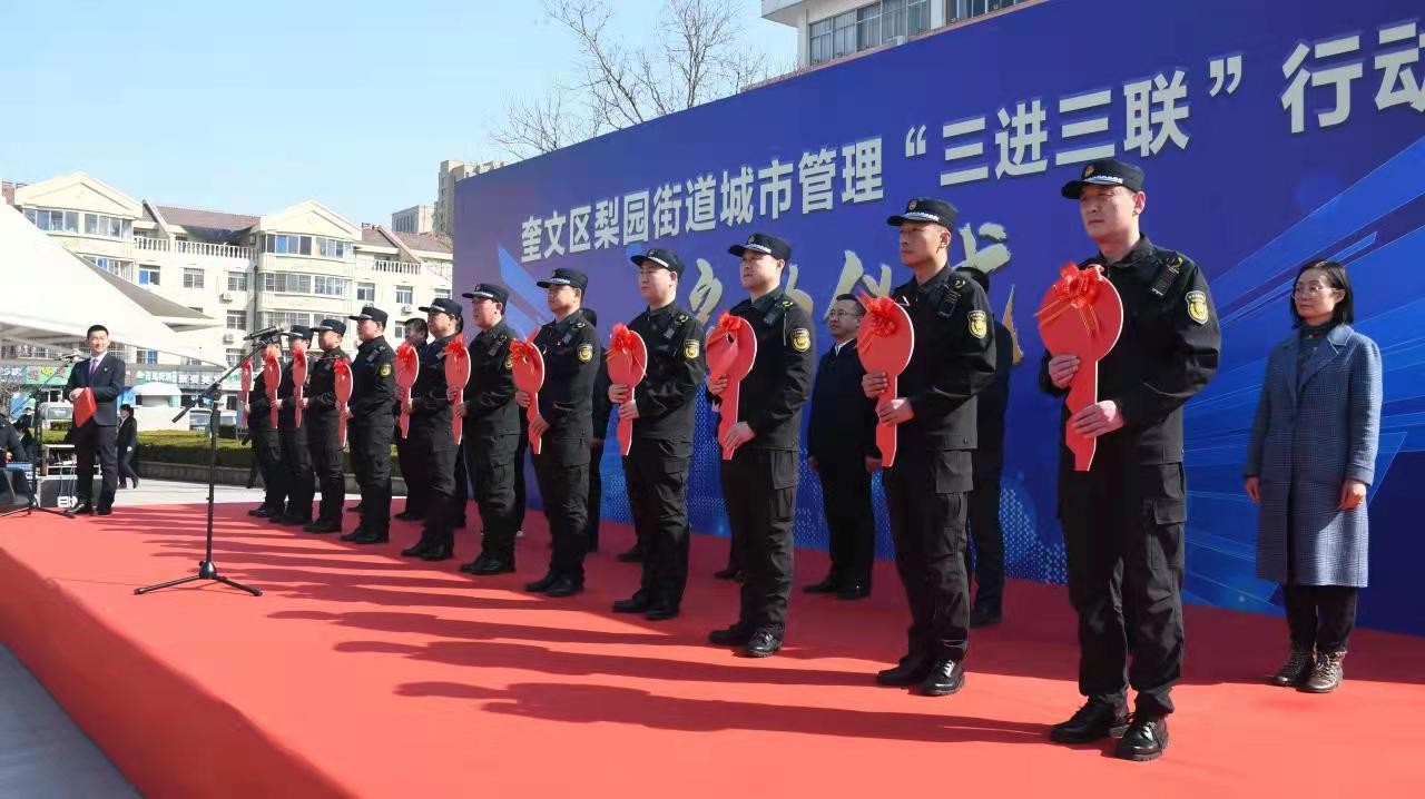 城市管理进社区,“三进三联”入民心。奎文区综合执法局联合梨园街道、市场监管、公安等城市管理部门,多方论证探索,试点创新打出“三进三联”组合拳。组建“一体化”综合行政执法队伍和“1+N+X”城市管理服务队伍,1名街道科级干部带领N名执法队员、街道干部,实现对小区、楼宇、沿街门店包靠全覆盖。行动开展以来,梨园街道投入50余万元增配专业执法车、电动巡逻车32辆,对讲机和执法记录仪40余部,已解决居民诉求600余件,组织联合执法行动20余次,拆除小区违章搭建、清理乱堆乱放、私占车位、店外经营1500余处。