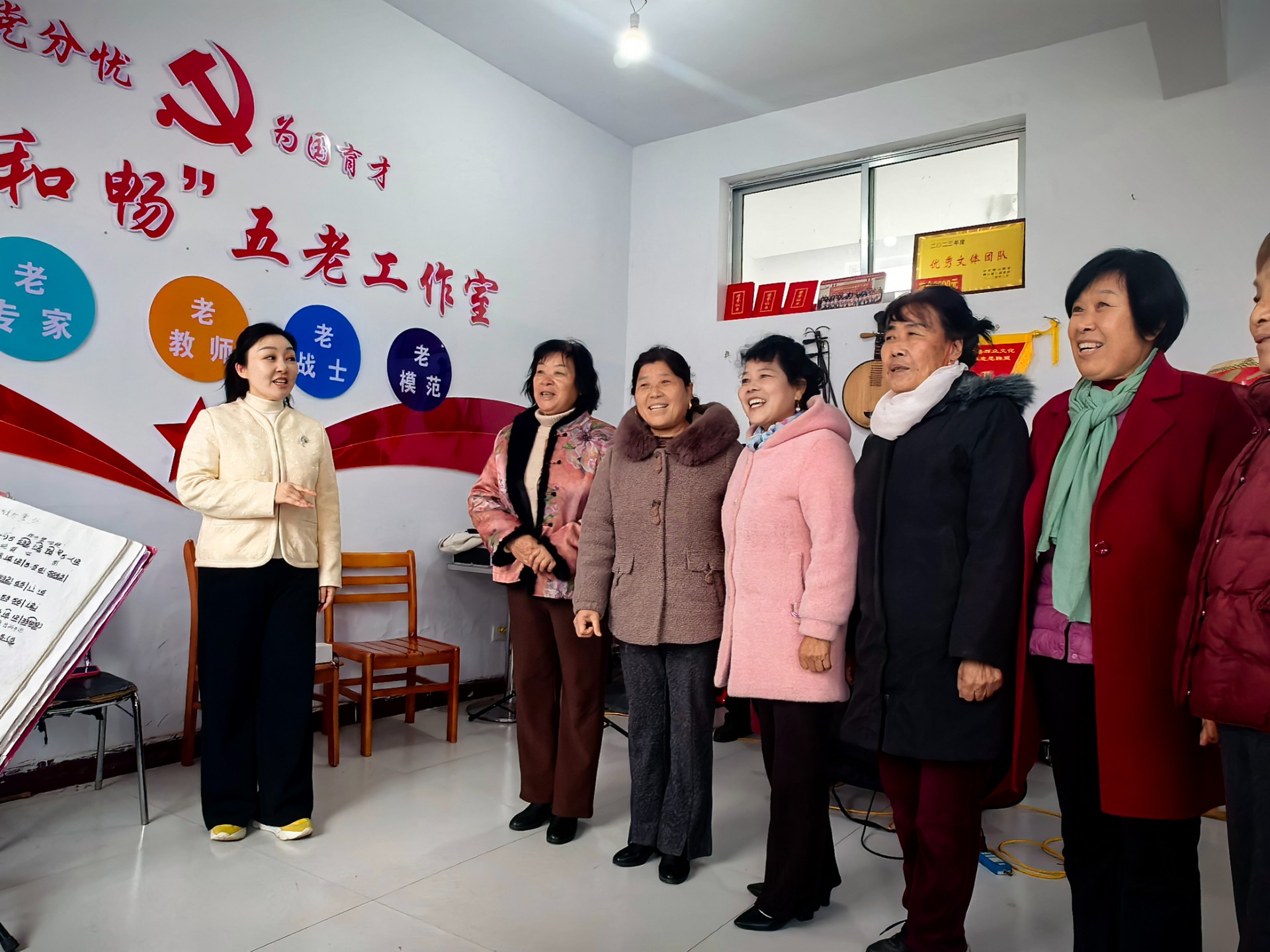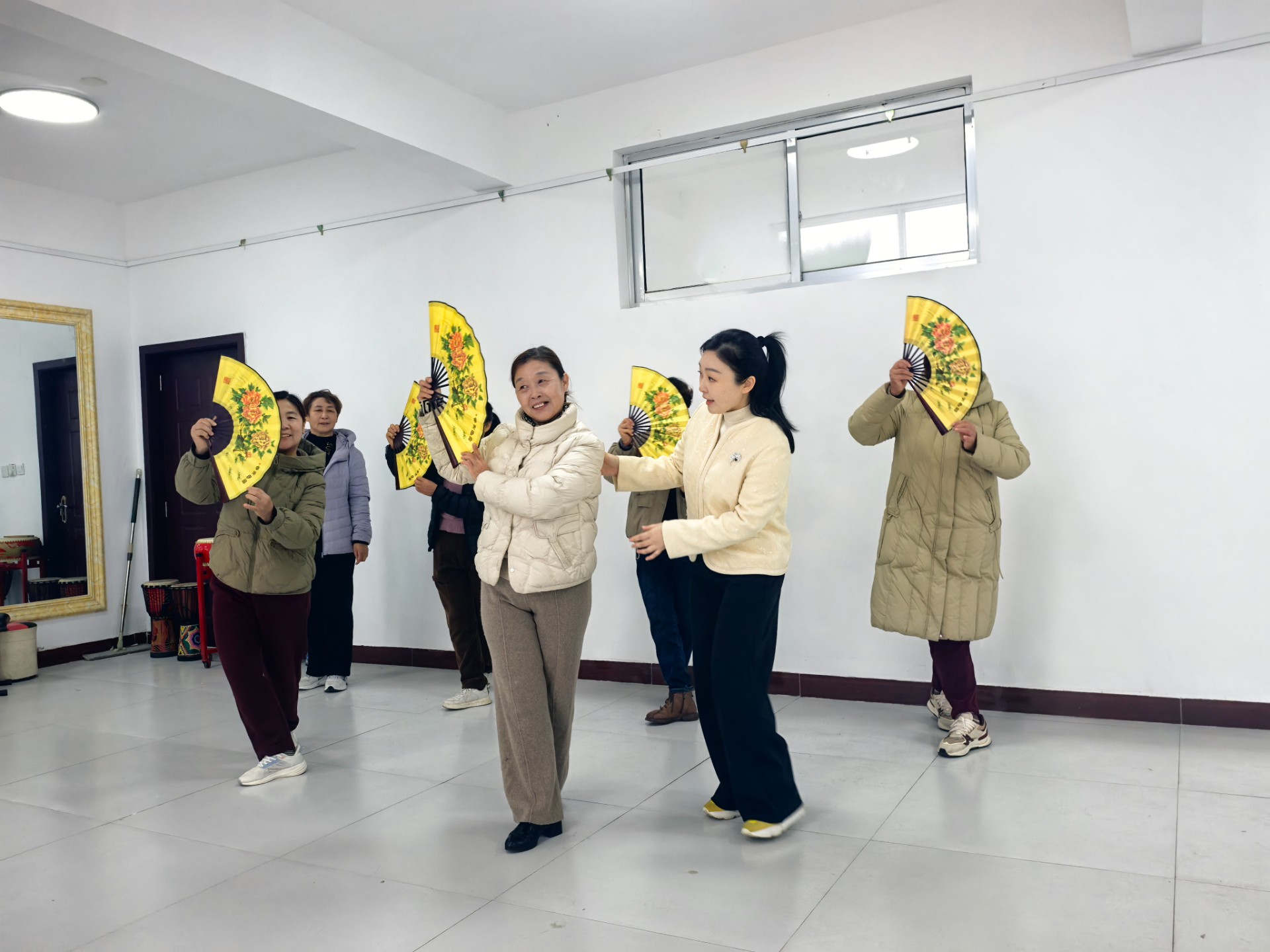 “握扇要稳,开合幅度得跟着节奏踩准点”“转身时脚步轻挪,扇子划出连贯弧线才好看”“唱戏曲要气沉丹田,咬字得字正腔圆才够味”——培训现场,张艳红充分考虑村民文艺基础参差不齐的实际,将专业术语转化为通俗易懂的“乡间话语”,采用“理论讲解+现场示范+一对一纠错”的模式,从扇子舞的基础手法、队形编排,到戏曲演唱的气息控制、情感表达,逐一拆解教学、手把手纠正。针对动作不规范、唱腔有误区等问题,她反复示范讲解,直到村民们完全掌握要领。
