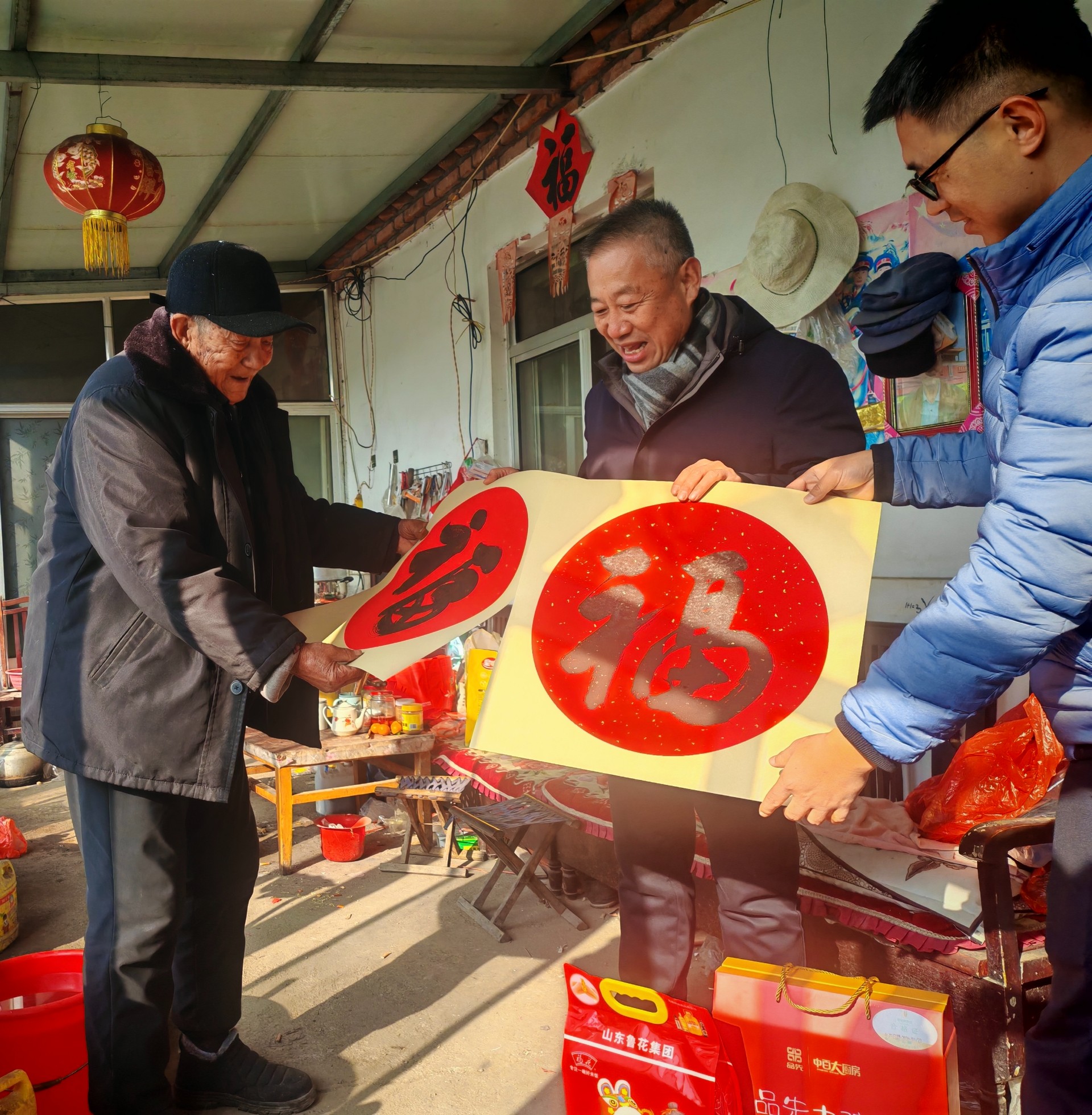 活动最后,王国栋带领团队走访了村内高龄老人和部分困难家庭,送去大米、鸡蛋等慰问品,并将现场书写的春联和“福”字亲手送到村民手中,传递新春的温暖祝福。