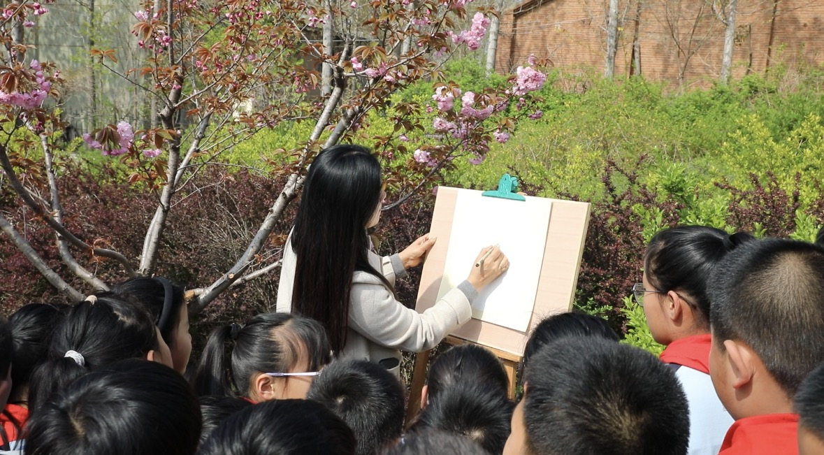“同学们,你们看身边的樱花,粉粉的、白白的,像不像天上飘下来的云朵?今天我们就坐在樱花树下,用毛笔和颜料,把这份美好画下来。”活动现场,刘海杰指着身旁盛放的樱花树,用温柔亲切的话语开启了教学。针对孩子们的特点,刘海杰没有追求技法的精湛,而是注重引导孩子们近距离观察樱花的形态——花瓣的层次、颜色的深浅、花枝的走向,鼓励孩子们大胆表达自己眼中的樱花。她找了一处樱花盛放的角落,铺开画纸,亲自上手示范,毛笔在她手中灵活运转,蘸取颜料、轻轻点染、顺势勾勒,一朵朵栩栩如生的樱花便跃然纸上,引得孩子们阵阵惊呼,一双双小眼睛里满是向往,纷纷迫不及待地拿起毛笔尝试。