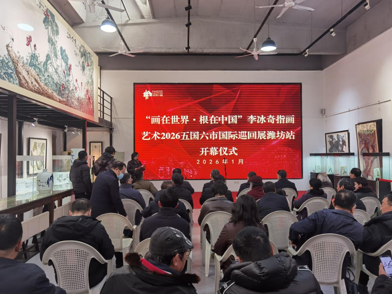 速豹新闻网苗露 肖莹坤 通讯员 孟曙光潍坊报道:1月5日,画在世界·根在中国李冰奇指画艺术2026五国六市国际巡回展潍坊站开幕仪式在坊茨