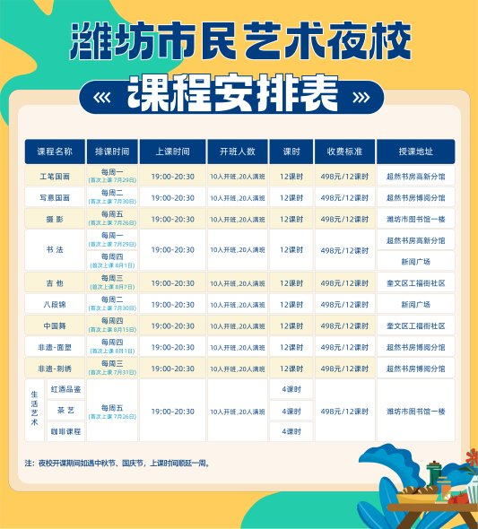 据了解,潍坊市民艺术夜校已经开放报名。首期夜校课程拟开设书法(2个班)、工笔国画、写意国画、摄影、吉他、八段锦、中国舞、非遗面塑、非遗刺绣、生活艺术(红酒品鉴、茶艺、咖啡课程)10个课程、11个班次,匹配专家老师14人。18岁以上市民均可报名参加。