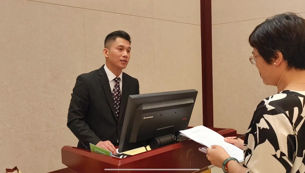在前厅服务环节比赛现场,选手们模拟真实场景,展现了快速精准的入住办理、细心周到的咨询服务以及对于突发状况的应变能力,让每一位“客人”感受到宾至如归的温馨。尤其是设置的英语服务接待,选手们表达熟练、热情礼貌,体现了对境外游客的良好的接待服务能力。