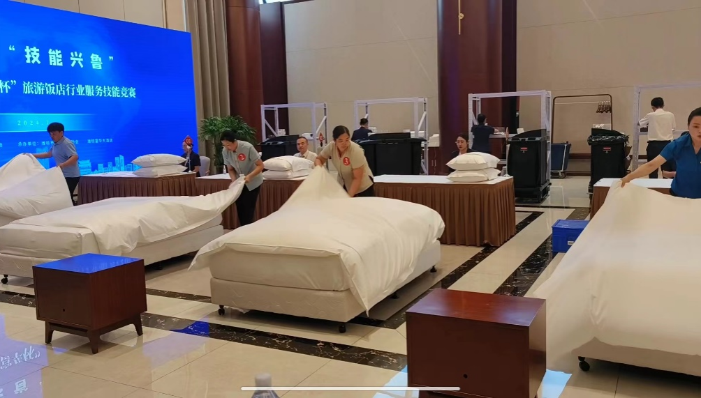在客房服务环节,选手们动作娴熟地铺设床单、包裹被芯、整齐叠放枕头,整个过程如行云流水,一气呵成。