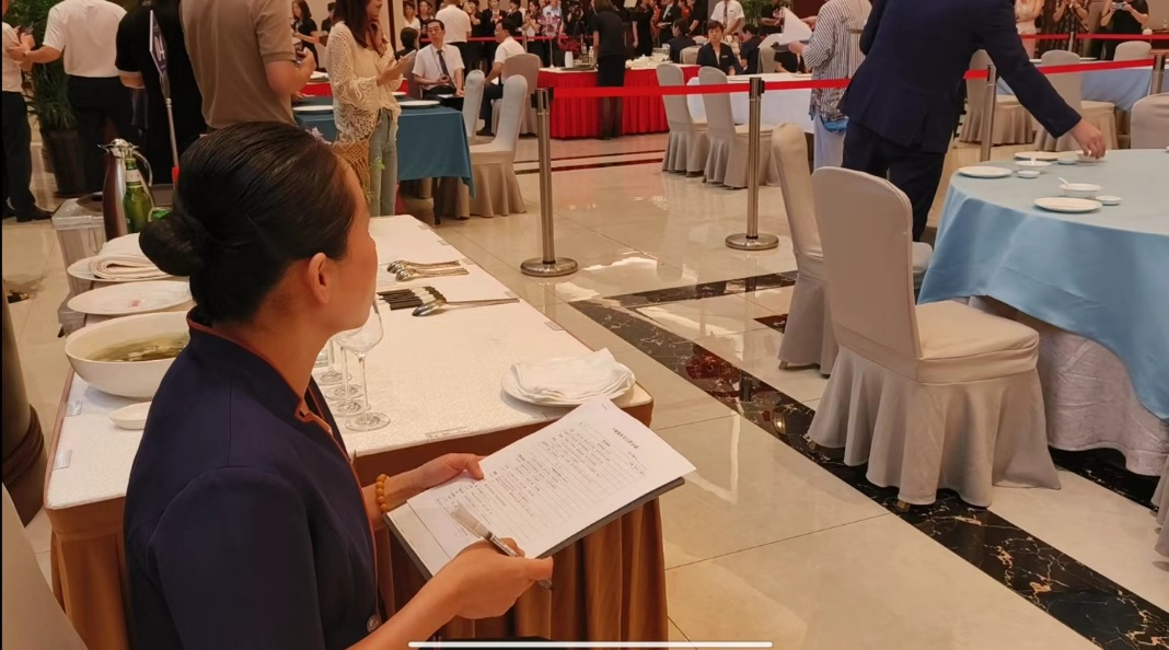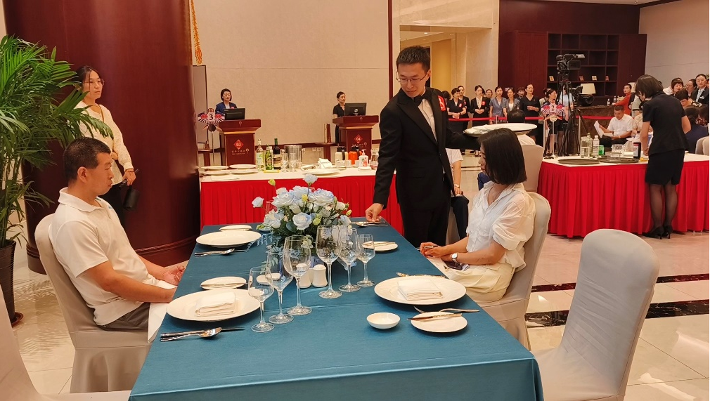 在中餐与西餐摆台项目中,比赛从铺台布开始,餐碟酒杯的摆放、模拟为客人提供服务等,每一项都考验着选手的专业水准和服务水平。整个比赛现场紧张有序,展现了潍坊市旅游饭店从业人员的朝气满满的精神风貌。