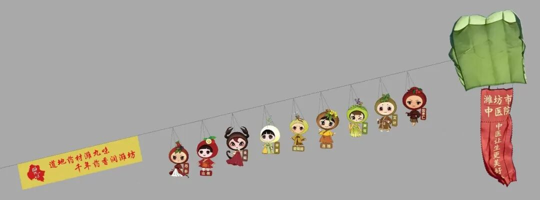 该风筝以潍坊传统非遗风筝为形,以潍坊道地药材“潍九味”为魂,将两者巧妙融合与创新,打造出独具辨识度的潍坊中医药文化新符号。呈串式结构,九只灵动单元依次相连,整体延展长达三十余米。每只单元风筝以一味道地中药材为主题,形象取自丹参、山楂、全蝎、半夏、密柴胡、连翘、黄芩、艾叶、酸枣仁,经艺术化提炼后,化作轻盈飘逸的药植精灵,迎风时起伏舒展,透出软体风筝的流动韵律。