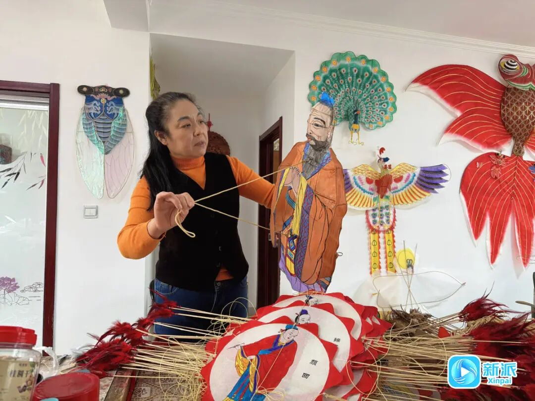 作为“风筝王”杨同科的第三代传人,杨红卫深耕风筝技艺四十余年。往年,她常以龙头蜈蚣风筝亮相风筝会。今年,她在传统潍坊风筝的基础上加以创新,融入儒家文化,用长串结构将圣贤群像徐徐展现在蓝天之上,让风筝成为承载文化叙事的空中画卷。“目前这只风筝已经全部完成,前几天进行了试飞,效果还有些不理想,这几天重点调试平衡与风力适配,确保以最佳状态在风筝会上放飞。”杨红卫一边介绍,指尖一边在竹篾上灵活翻飞,每一处微调都凝聚她着对技艺的坚守。