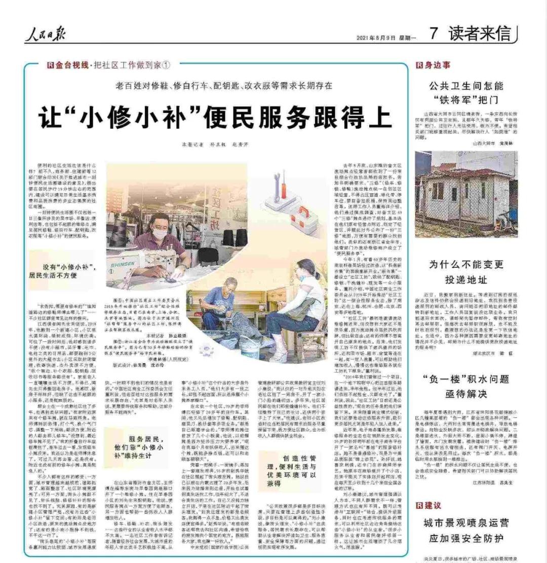 8月9日,人民日报以《让“小修小补”便民服务跟得上》为题,聚焦“一刻钟便民生活圈”,其中对潍坊市奎文区“小三修”便民摊点服务管理经验做法进行报道。