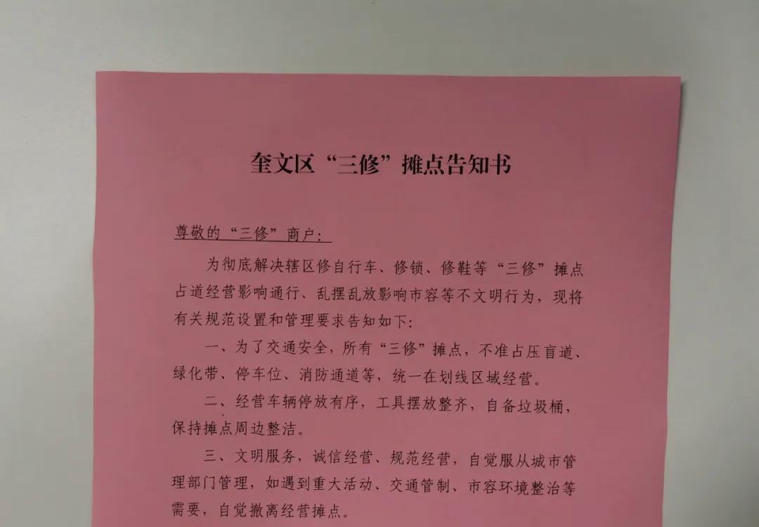 为了规范管理,该区综合行政执法局和经营业户签订了《奎文区“三修”摊点告知书》,明确了相关要求,日常管理坚持“721工作法”(即70%的问题用服务手段解决、20%的问题用管理手段解决、10%的问题用执法手段解决)以服务引导为主,保障“小三修”摊点有序经营。
