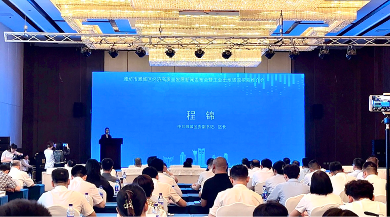 潍坊市潍城区经济高质量发展新闻发布会暨工业土地资源招商推介会于7月4日10时30分在蓝海大酒店御礼厅举行。此次新闻发布会特别邀请了,潍城区委书记刘金国,潍城区委副书记、区长程锦,以及潍坊市委台港澳办、市工商联、市发改委、市工信局、投促局等市直部门的负责同志和相关科室负责同志,部分外地商会会长和潍城区招商大使及在谈项目负责人等出席。发布会介绍了潍城经济社会高质量发展建设情况和工业土地资源招商情况。