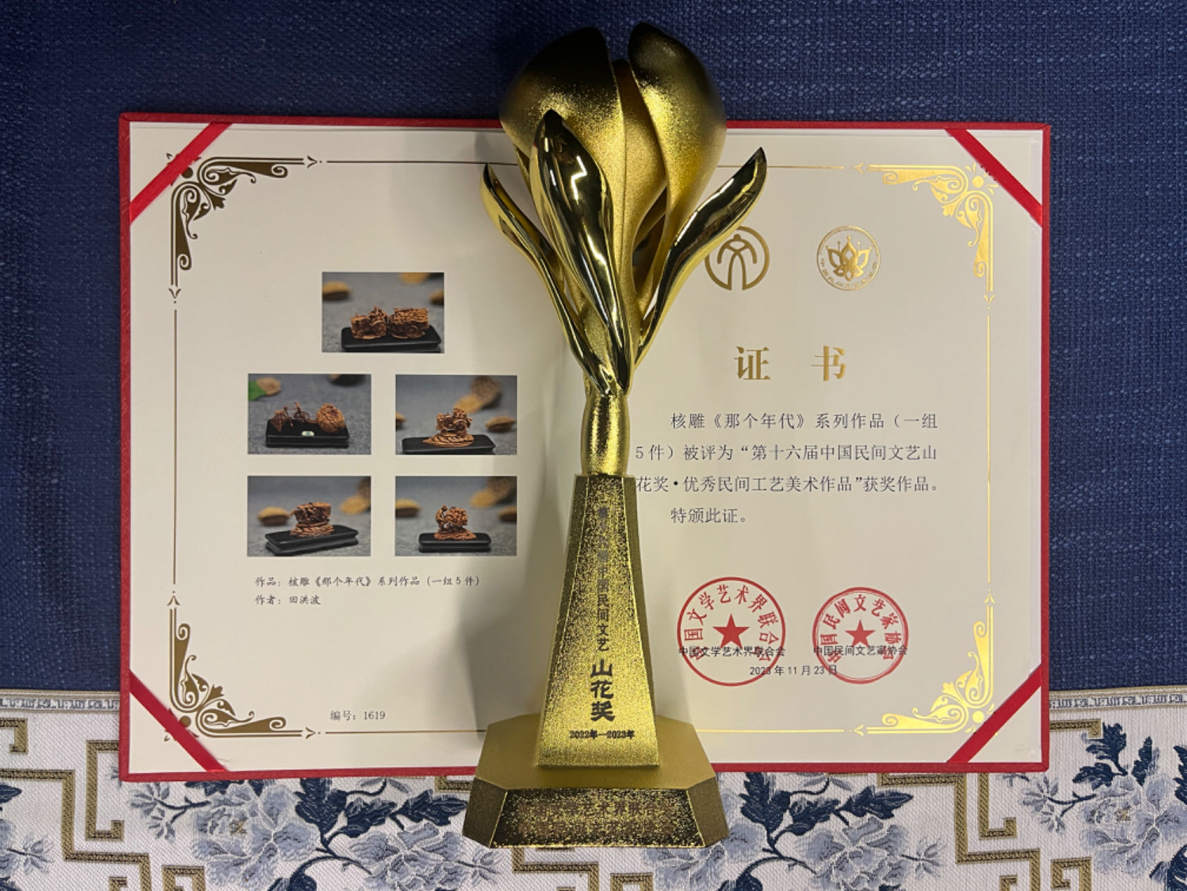 “中国民间文艺山花奖”是经中宣部批准,由中国文学艺术界联合会、中国民间文艺家协会联合主办的国家级民间文艺大奖,与电影“百花奖”、电视“金鹰奖”、戏曲“梅花奖”、舞蹈“荷花奖”等同属我国文艺界的最高奖项。田洪波《那个年代》系列核雕作品采用圆雕、浮雕、镂空、镶嵌等手法,创作了《满载而归》《马拉车》《大丰收》《红色匠心》《恋》等作品,创作时间跨度10余年,2020年创作完成,惟妙惟肖地展现了“那个年代”的生活场景。该作品连续参加第十三、十四、十五和十六届中国民间文艺“山花奖”评选活动,连续四次入围中国民间文艺总决赛,今年,终于摘得“第十六届中国民间文艺山花奖”桂冠,是潍坊市文艺作品在全国重点文艺奖项评选中取得的重大突破。