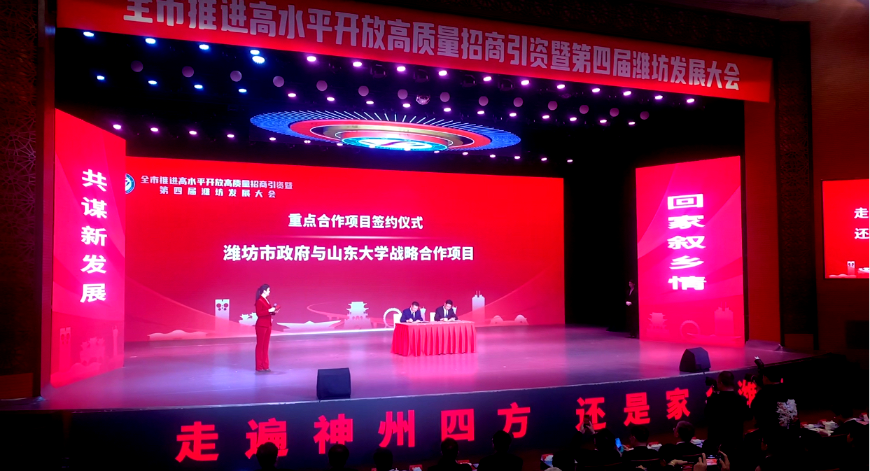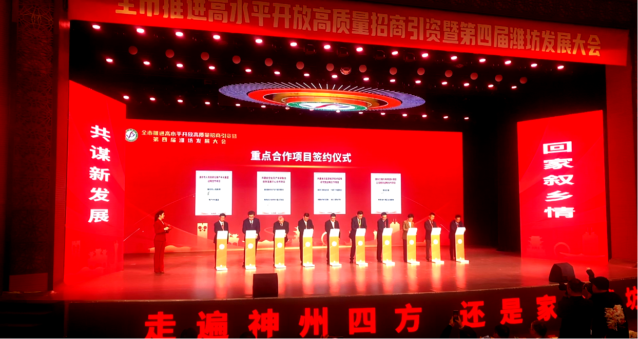 会上,举行了山东(潍坊)华侨开放发展试验区揭牌仪式;潍坊市人民政府与上海交通大学、山东大学签署了合作协议;潍坊市人民政府与物产中大集团战略合作项目,共建航空航天产学研融合创新发展中心合作项目,共建潍坊低空经济技术应用研究院战略合作项目,潍坊日报与粤港澳大湾区主流媒体战略合作项目等重点合作项目进行了签约;潍商代表宣读了《潍商联盟倡议书》。