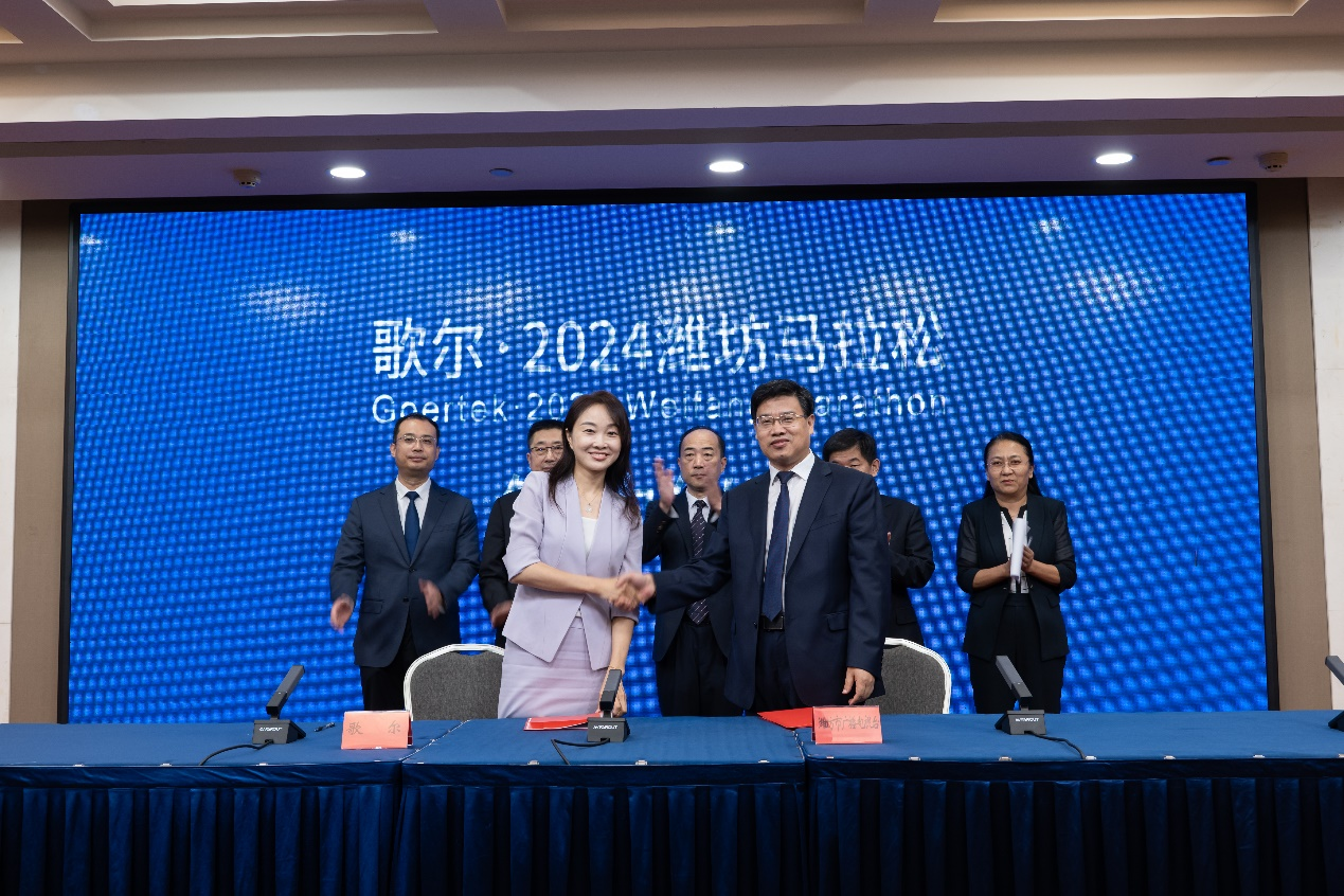 发布会最后,主办方与本次赛事的独家冠名商歌尔进行了签约仪式,并发布了潍马奔跑大使“歌小宝”裸眼3D形象片以及歌尔·2024 潍坊马拉松系列宣传片之《跨越山海 “潍”你而来》。