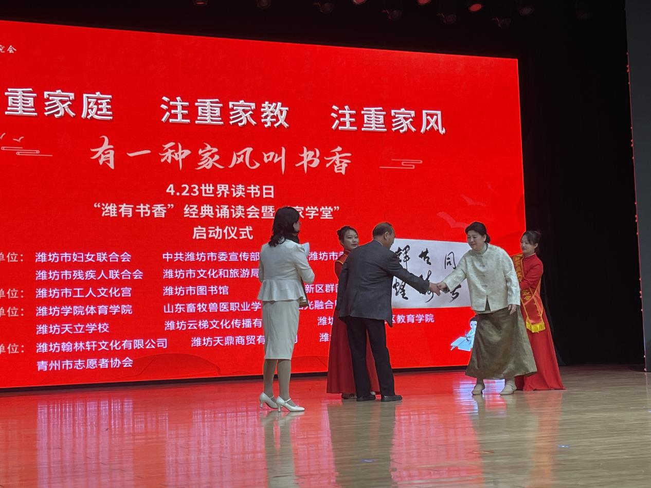 速豹新闻网苗露 李世苗潍坊报道:在第30个“世界读书日”来临之际,4月23日上午,由潍坊市妇联、市委宣传部、市委社工部、市残联、市文旅局指导指导,潍坊家庭文化研究会联合潍坊市工人文化宫、市图书馆、高新区群团中心共同举办“4.23世界读书日潍有书香经典诵读会暨家学堂启动仪式"主题活动在潍坊市工人文化宫隆重举行。出席活动的嘉宾与600余名热爱阅读的市民齐聚一堂,共赴一场传统文化与家庭文明交融的精神盛宴。