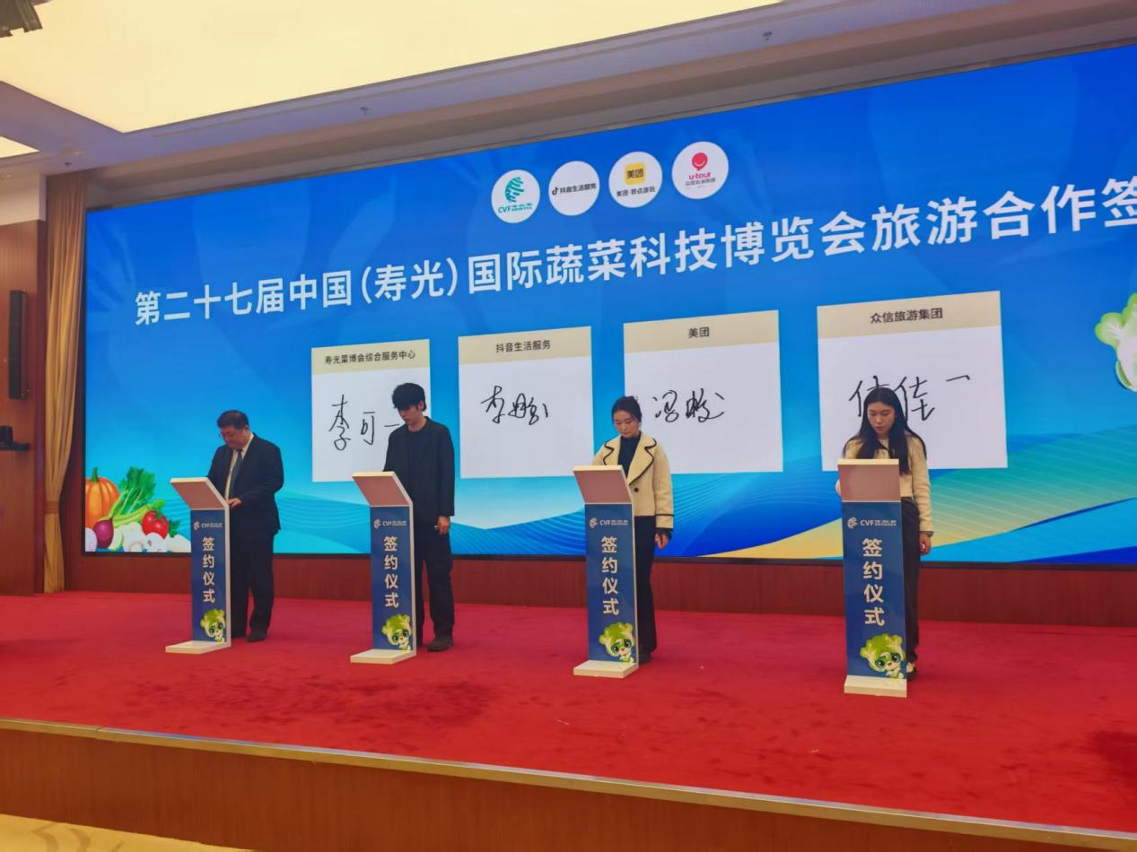 见面会上,多项合作签约与揭牌仪式同步举行,为菜博会市场化、国际化发展注入新动能。寿光菜博会综合服务中心与抖音、美团及众信旅游集团签署合作协议,全面拓展线上宣传、文旅引流、产销对接渠道;北方蔬菜报北京运营中心与中腾国兴智库中心达成合作框架协议,进一步强化标准输出、媒体传播与智库支撑,助力寿光蔬菜产业与菜博会品牌走向更广阔舞台。