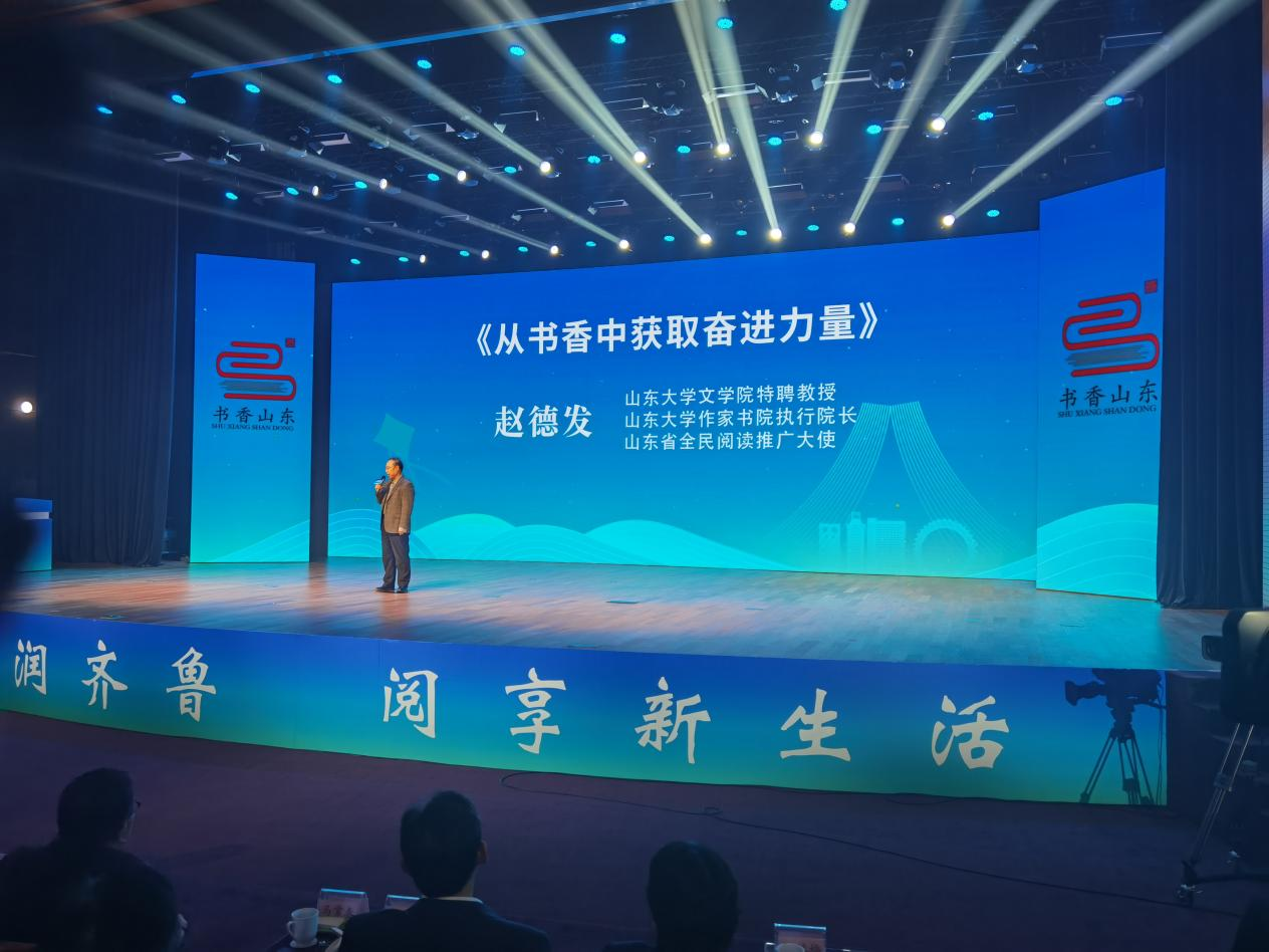 现场,山东省全民阅读推广大使、山东大学文学院特聘教授、山东大学作家书院执行院长赵德发从创作角度分享了阅读心得,“阅读是最方便的教育、最深刻的自我修行。几十年来,我一直严格制定阅读计划,坚持速读与精度相结合,从书籍中汲取养分,才保证了作品的完整度。”