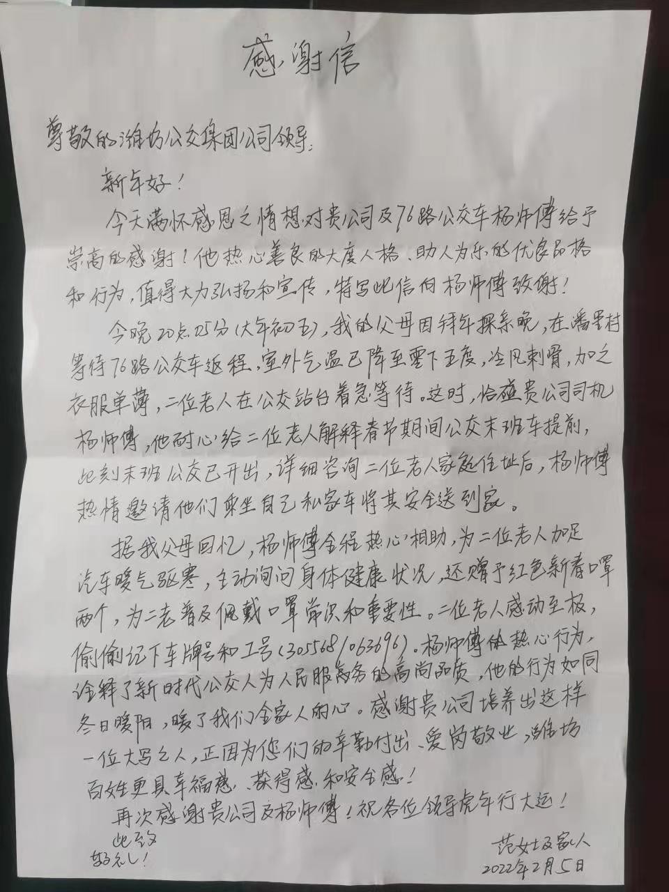 “他的行为如同冬日暖阳,暖了我们全家人的心。”近日,潍坊市民范女士将一份手写感谢信送到潍坊公交三公司府东场站,并拨打了热线电话,对76路乘务员杨洋提出了表扬和感谢。