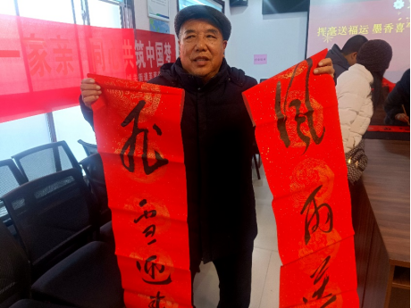 活动现场,刘太胜、刘伟红两位书法爱好者现场书写福字、对联。他们泼墨挥毫,将对新年的美好祝愿凝聚在笔尖,一个个苍劲有力的“福”字、一幅幅寓意吉祥的对联跃然纸上,吸引了众多居民前来观赏。