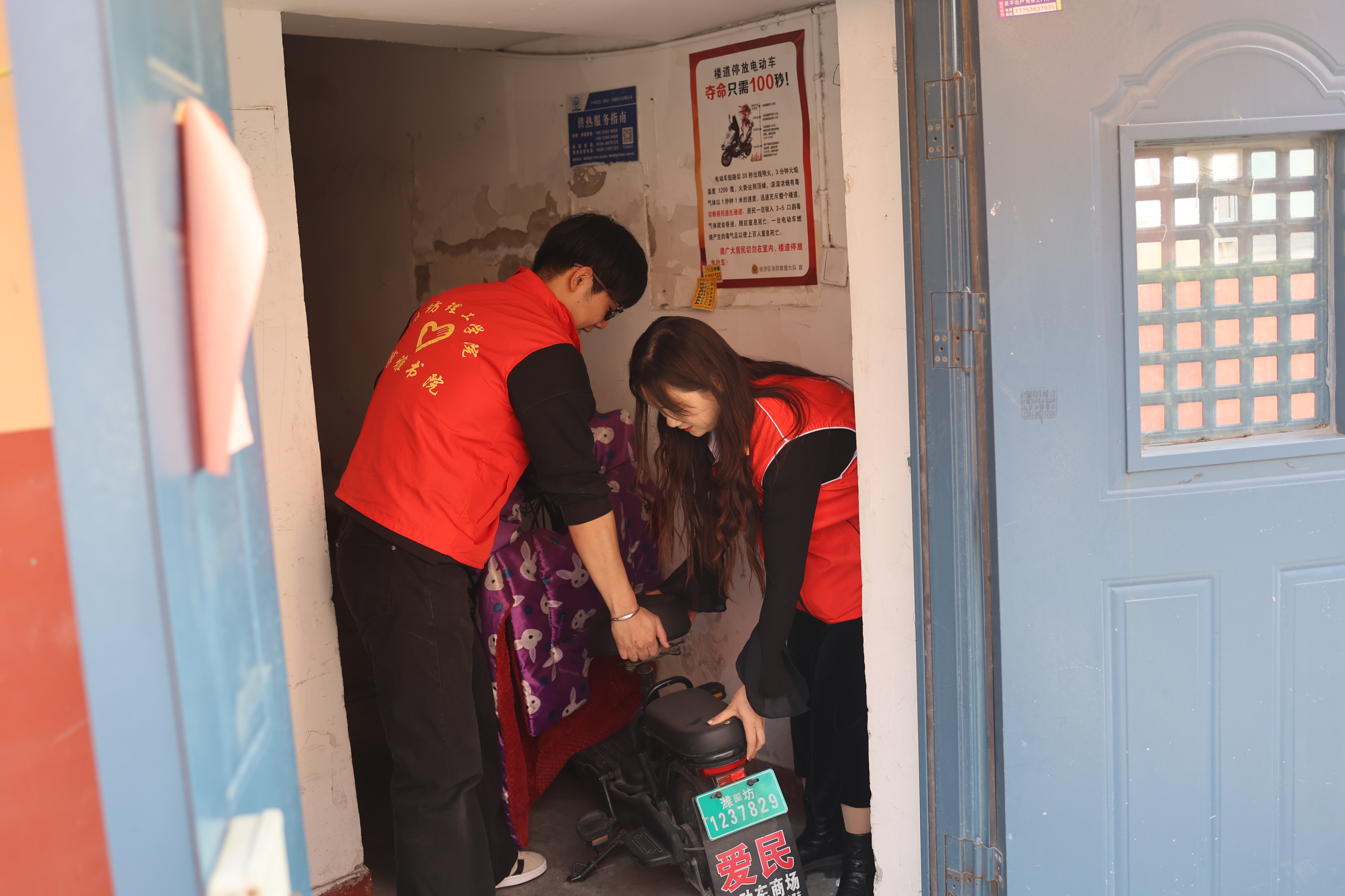 针对春季火灾防控问题,潍坊经济开发区消防志愿服务队联合社区及消防志愿者深入新海社区电力三小区,开展春季防火宣传教育活动。志愿者帮助居民排查楼道杂物堆积、电动车违规停放充电等安全隐患,耐心劝导居民规范停放电动车,协助清理违规占道车辆与楼道堆积物,有效打通生命通道“最后一米”,净化居民楼消防安全环境,从源头防范火灾事故发生。