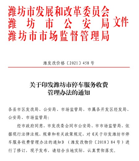 日前,潍坊市发改委会同市公安局、市市场监管局联合印发《关于印发潍坊市停车服务收费管理办法的通知》(以下简称《通知》),自2022年1月1