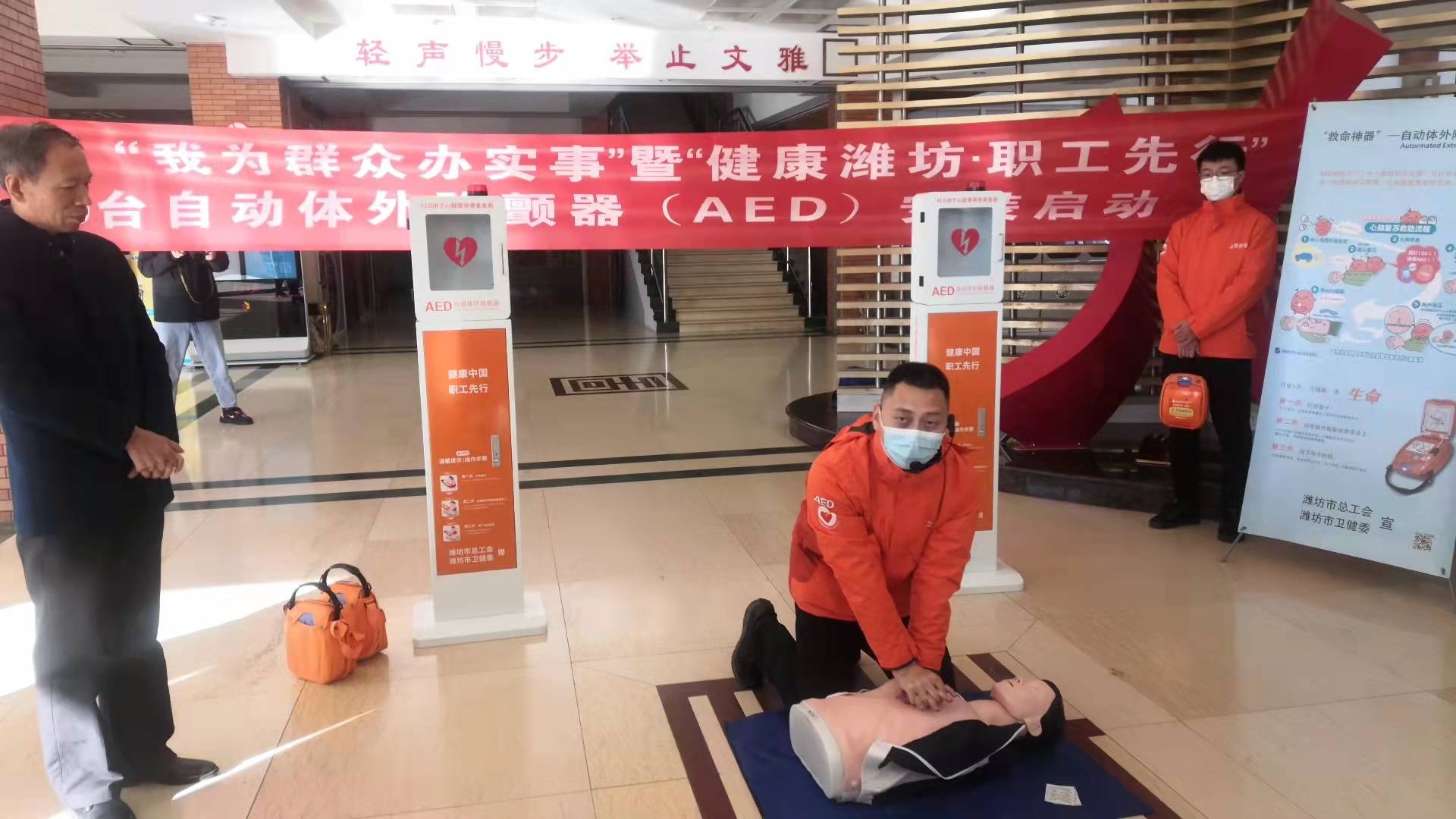 11月11日,潍坊市总工会开展的“我为群众办实事”暨“健康潍坊·职工先行”300台自动体外除颤器AED安装配置工作全面展开。